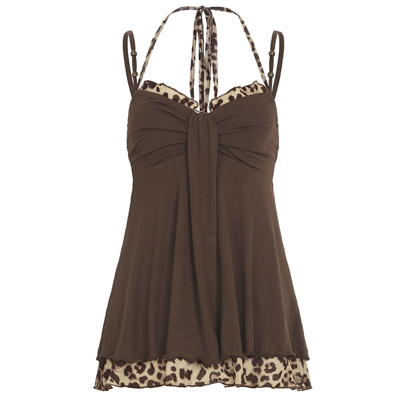 Sense Leopard Splicing Sling Niche Beaded Halter Tied Top