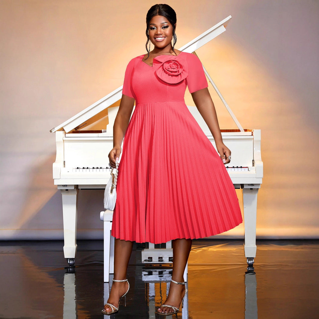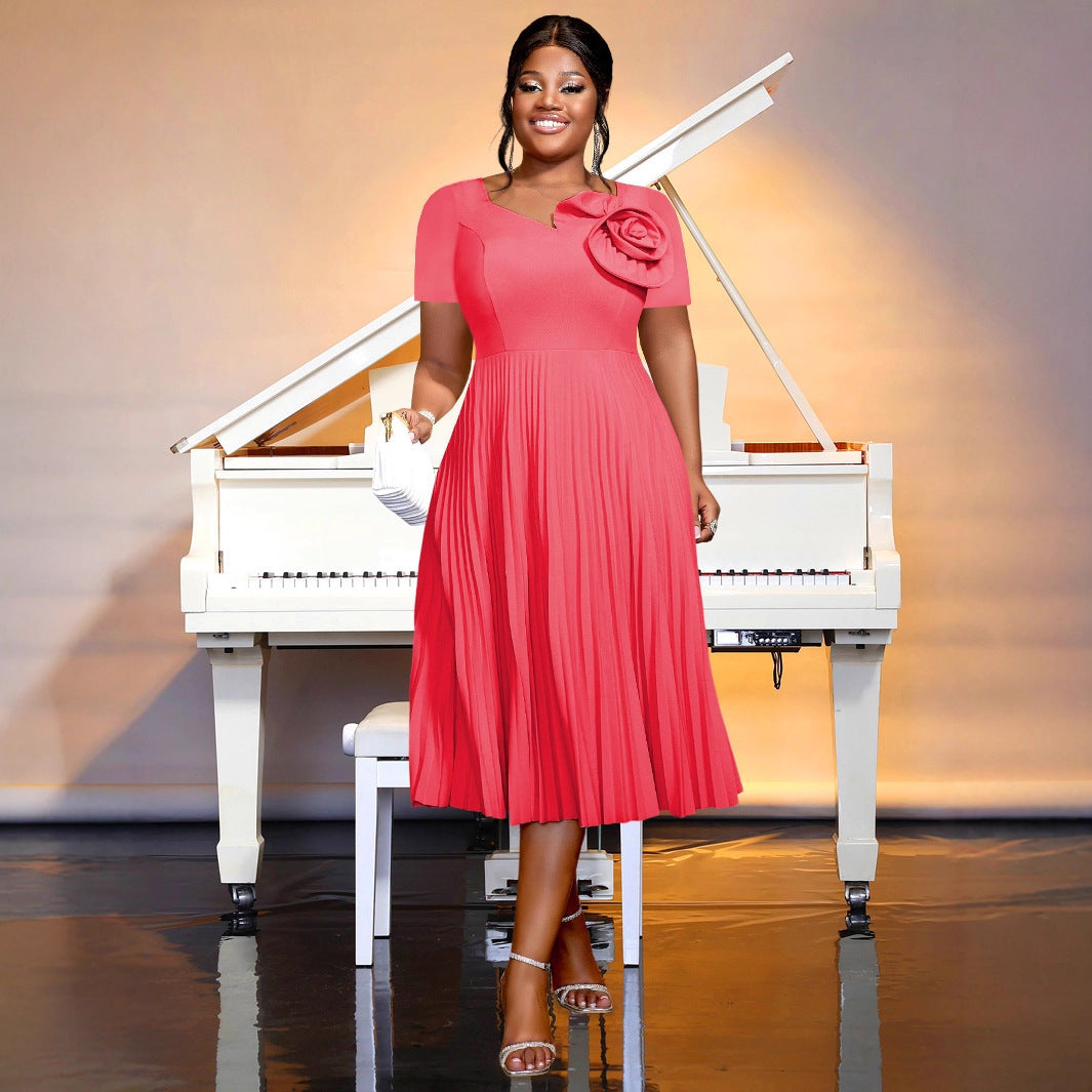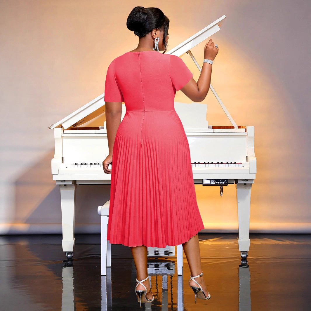 Women's Watermelon Red Short-sleeved Lace Mid-length Summer Pleated Dress